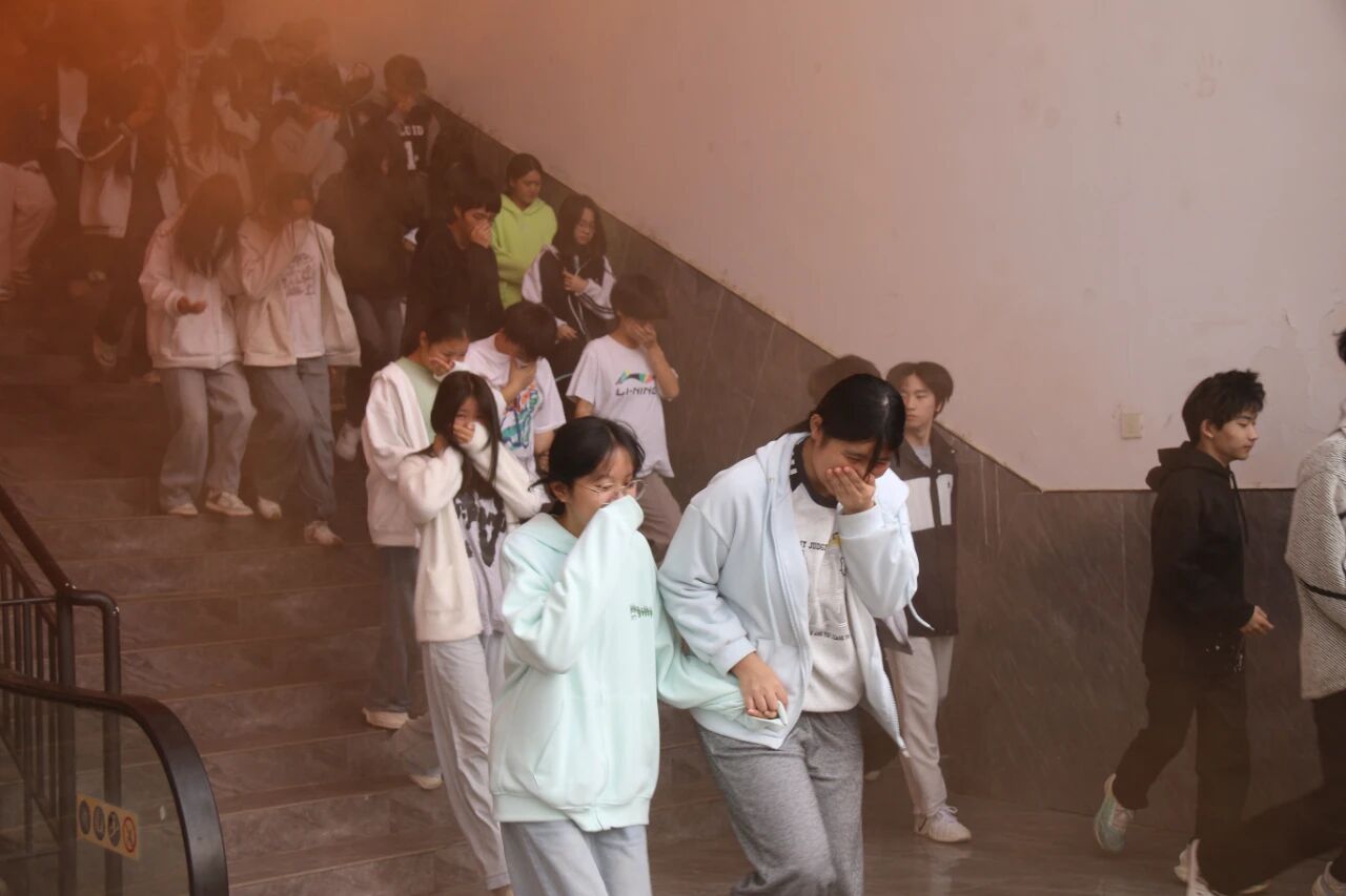 急促的消防警报声划破校园的宁静,演练正式拉开帷幕。各班班主任迅速组织学生用湿毛巾捂住口鼻,弯腰低姿,按照预定疏散路线,快速、有序地向操场安全区域撤离。途中,同学们听从指挥、不推不挤,严格遵守疏散秩序。疏导员老师们在各楼层转角、楼梯口等关键位置引导疏散,确保每一名师生都能安全撤离。整个疏散过程紧张而不慌乱,仅用4分17秒,全校师生便全部撤离至指定安全区域,各班班主任随即清点人数并上报演练总指挥。