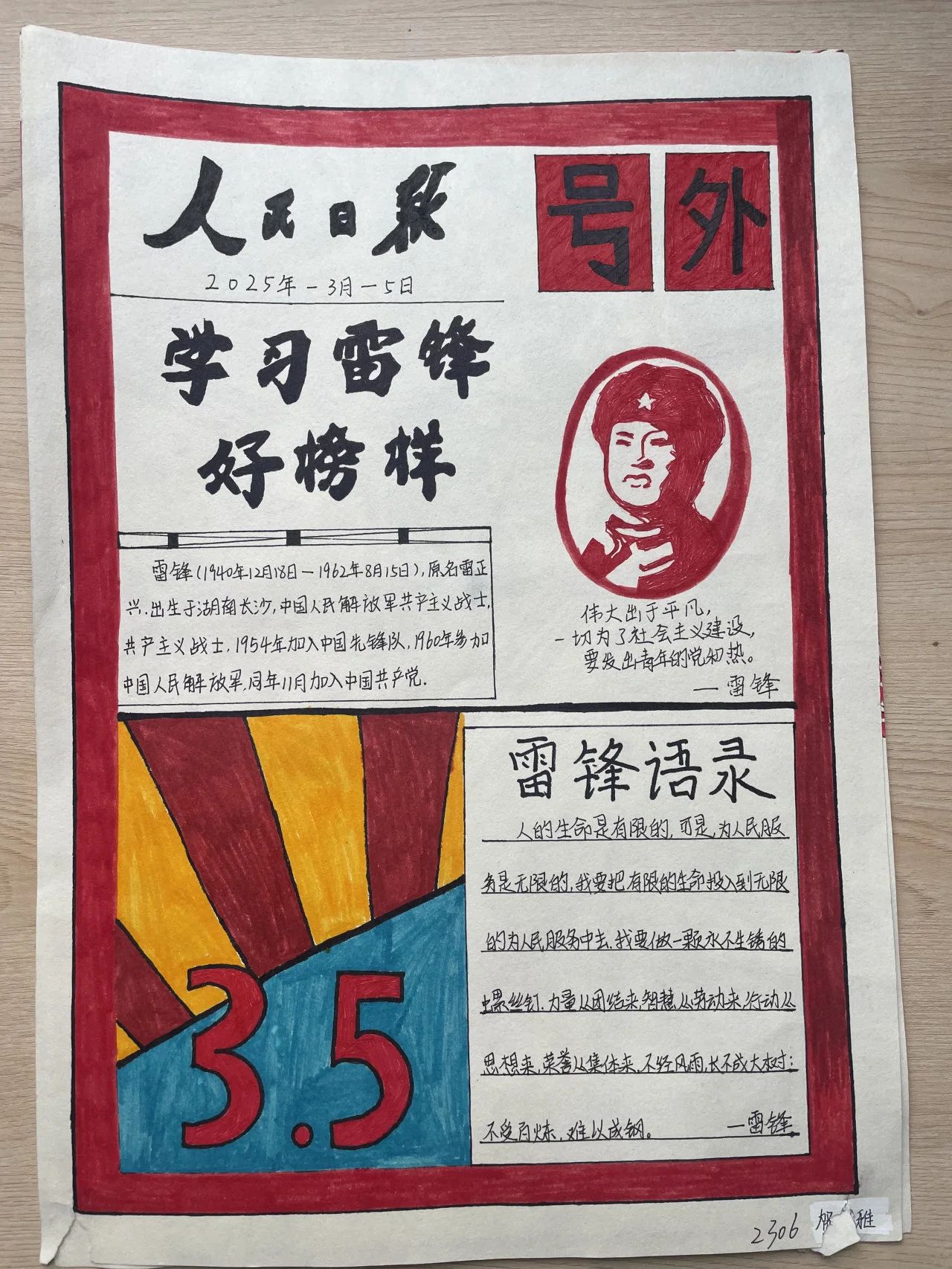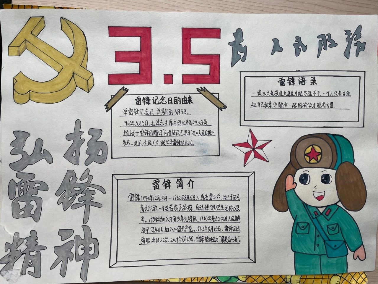 各班级同学以小组或个人为单位,精心构思、认真绘制手抄报,展现自己对雷锋精神的理解。收集到的手抄报作品主题鲜明,内容丰富,形式多样。有的用生动的绘画展现雷锋的形象,有的通过工整的文字阐述雷锋精神的内涵,还有的列举了身边的雷锋式好人好事。