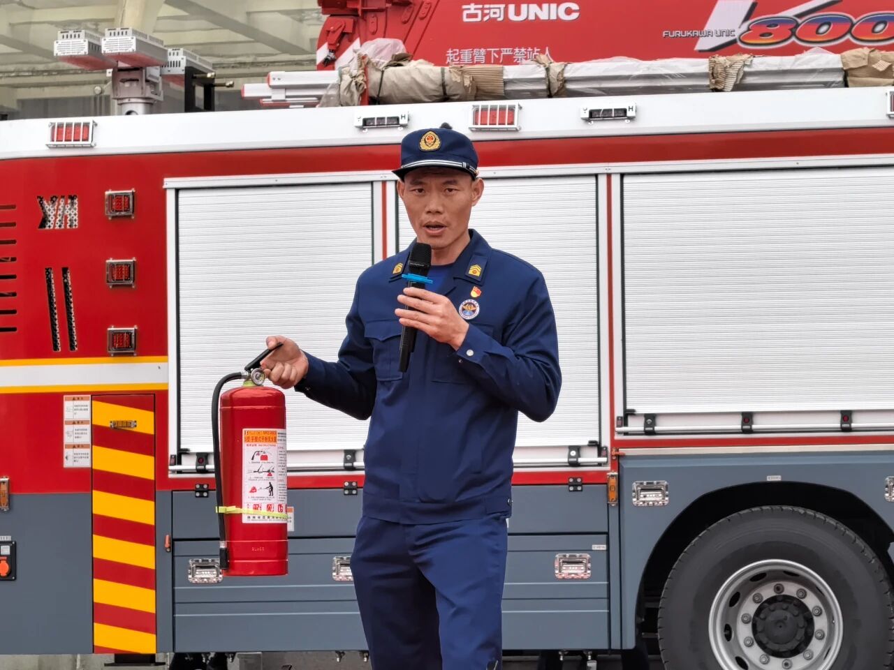 随后,开福区消防救援大队星月消防站消防员结合校园火灾特点,为师生们带来了生动实用的消防安全知识讲解。消防员用通俗易懂的语言,详细介绍火灾初期扑救方法、灭火器正确使用方法及火场逃生自救技巧,重点强调日常校园防火的注意事项,如不私拉乱接电线、正确使用电器设备等。在实操环节,教官现场示范了灭火器“提、拔、握、压”的使用要领,并邀请学生代表亲自上手操作,让大家在实践中掌握灭火技能。