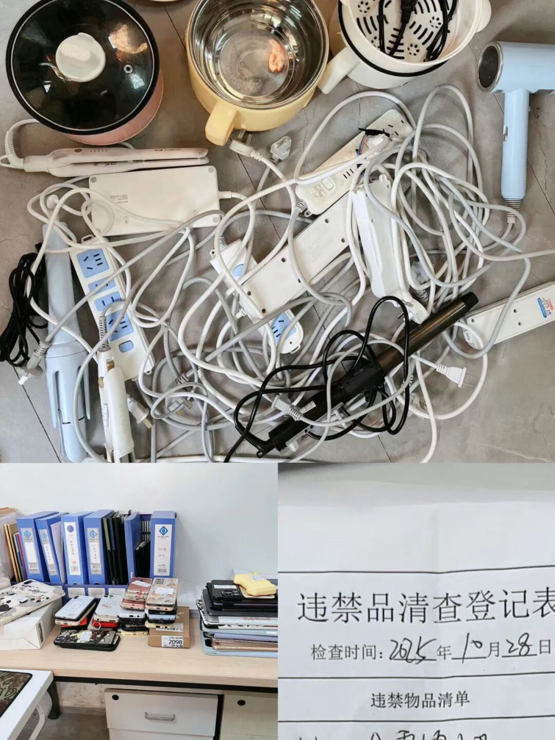 行动前,学校召开专项工作会议,明确检查目的、范围和重点,要求参与人员严格按照规定流程执行,注意方式方法,保护学生隐私,确保检查工作顺利进行。行动组分两组同时对男女生宿舍进行集中清查。检查组逐人逐床展开清查,特别对柜子、床底等隐蔽角落进行了细致检查,以防学生藏匿管制刀具类、大功率电器等违禁物品。