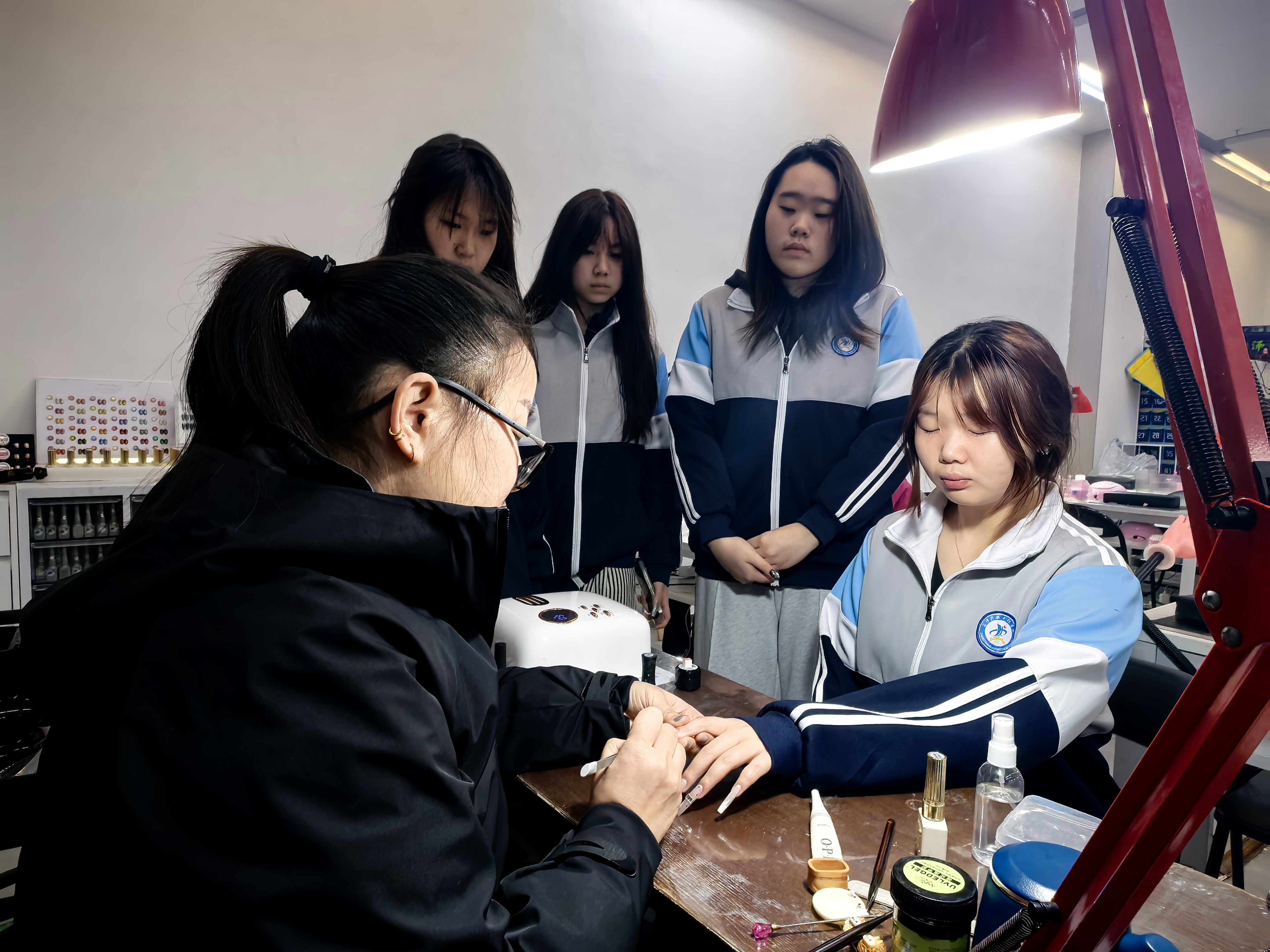 在专业导师与企业驻校导师的双重指导下,学生轮岗担任化妆造型师、形象设计师、服饰搭配师、美甲师等真实岗位角色,在沉浸式的职业场景中完成从技能训练到综合服务的过渡,让专业学习与未来职场自然衔接,实现毕业即能上岗的培养目标。